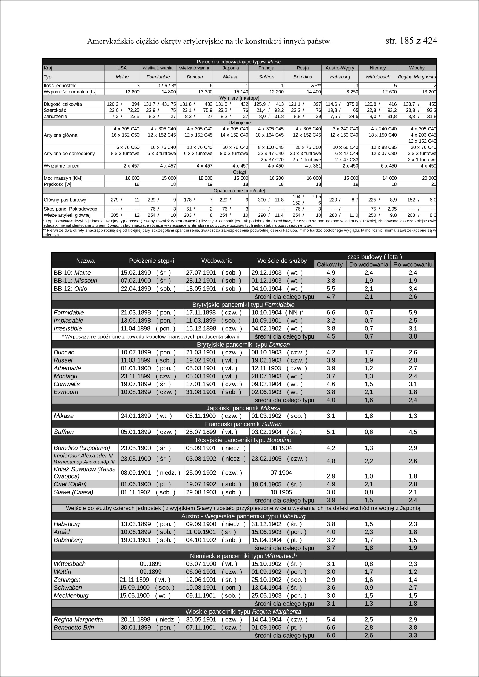 Jest to pierwszy tom, z planowanych pięciu, dotyczący historii projektowania oraz konstrukcji amerykańskich ciężkich okrętów artyleryjskich. Omówione są wielkie krążowniki, oraz pancerniki budowane w USA. Każdy z typów został opisany wraz z projektowanymi w tym samym czasie konstrukcjami innych państw. Jako kryterium wyboru wybrano daty rozpoczęcia budowy okrętów. Występowały wówczas duże różnice w czasie budowy w poszczególnych krajach. Tom I obejmuje okres końca XIX oraz początków XX wieku. Opisano wszystkie amerykańskie pancerniki i krążowniki pancerne okresu predrednotów. Opis zawiera założenia projektowe, oraz konstrukcję okrętów. Każdy opisany typ jest zilustrowany. Rysunki zawierają przekroje wzdłużne i poprzeczne, rozkład pomieszczeń, płyt pancernych. Na koniec opisu każdego typu amerykańskiego zamieszczony jest rysunek zbiorczy, na którym zamieszczono obok siebie rysunki wszystkich opisanych zagranicznych odpowiedników danego typu. Rysunki zostały wykonane w tej samej skali. Przekroje wzdłużne 1:1000, poprzeczne 1:500. Od tej zasady poczyniono nieliczne wyjątki, za każdym razem zaznaczone w tekście. Pozwala to na porównanie wielkości poszczególnych okrętów. Na końcu książki załączono dwie wkładki o rozmiarze A3, zawierające porównanie wielkości wszystkich opisanych w tym tomie ciężkich okrętów USA. Dodatkowo załączono dokładne opisy uzbrojenia. Działa zostały rozdzielone na artylerię ciężką, średnią i służącą do samoobrony przed torpedowcami. Posortowano je według kolejności pojawiania się w służbie, bez względu na kaliber czy narodowość. Drugie wydanie zostało znacząco rozszerzone.