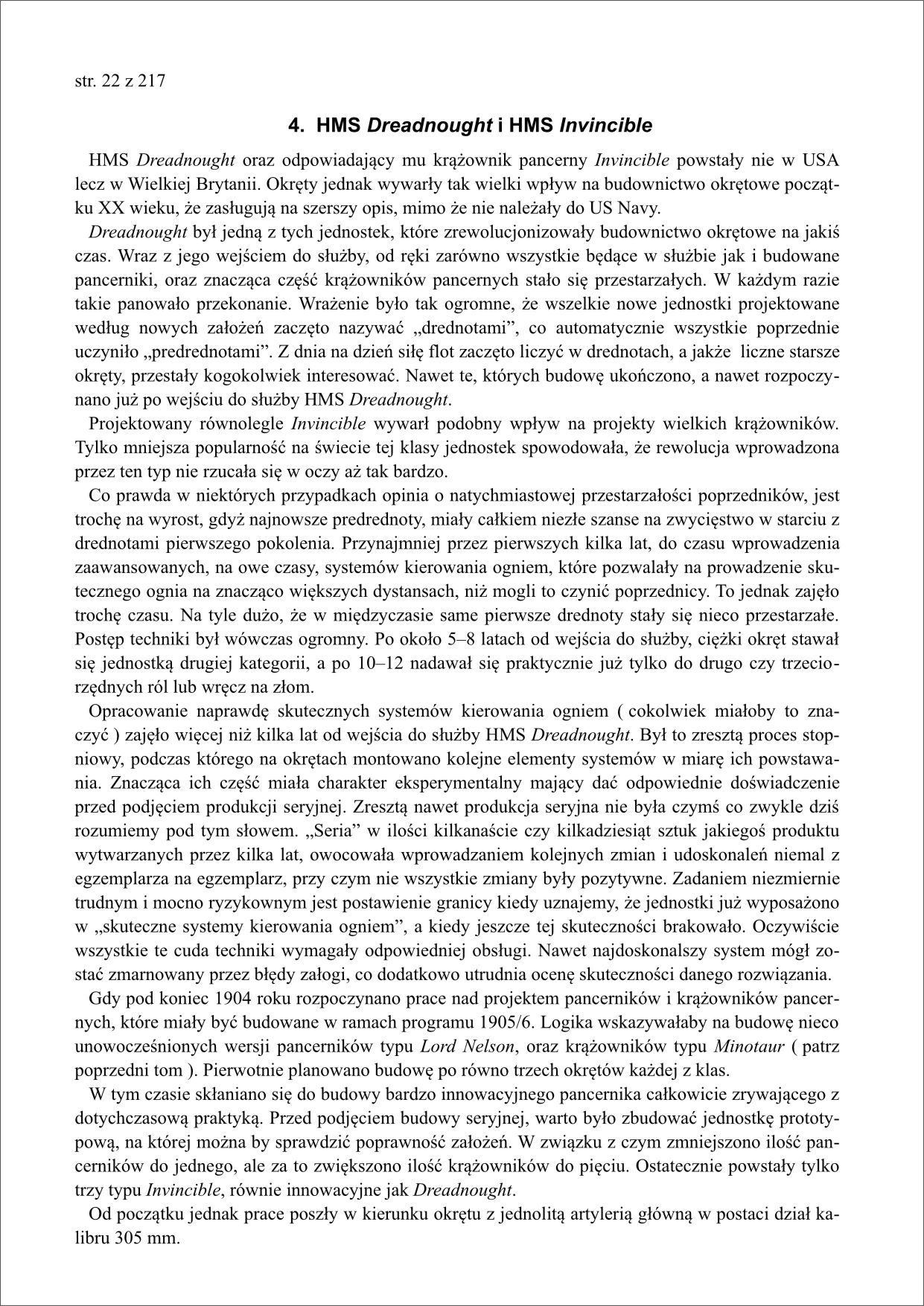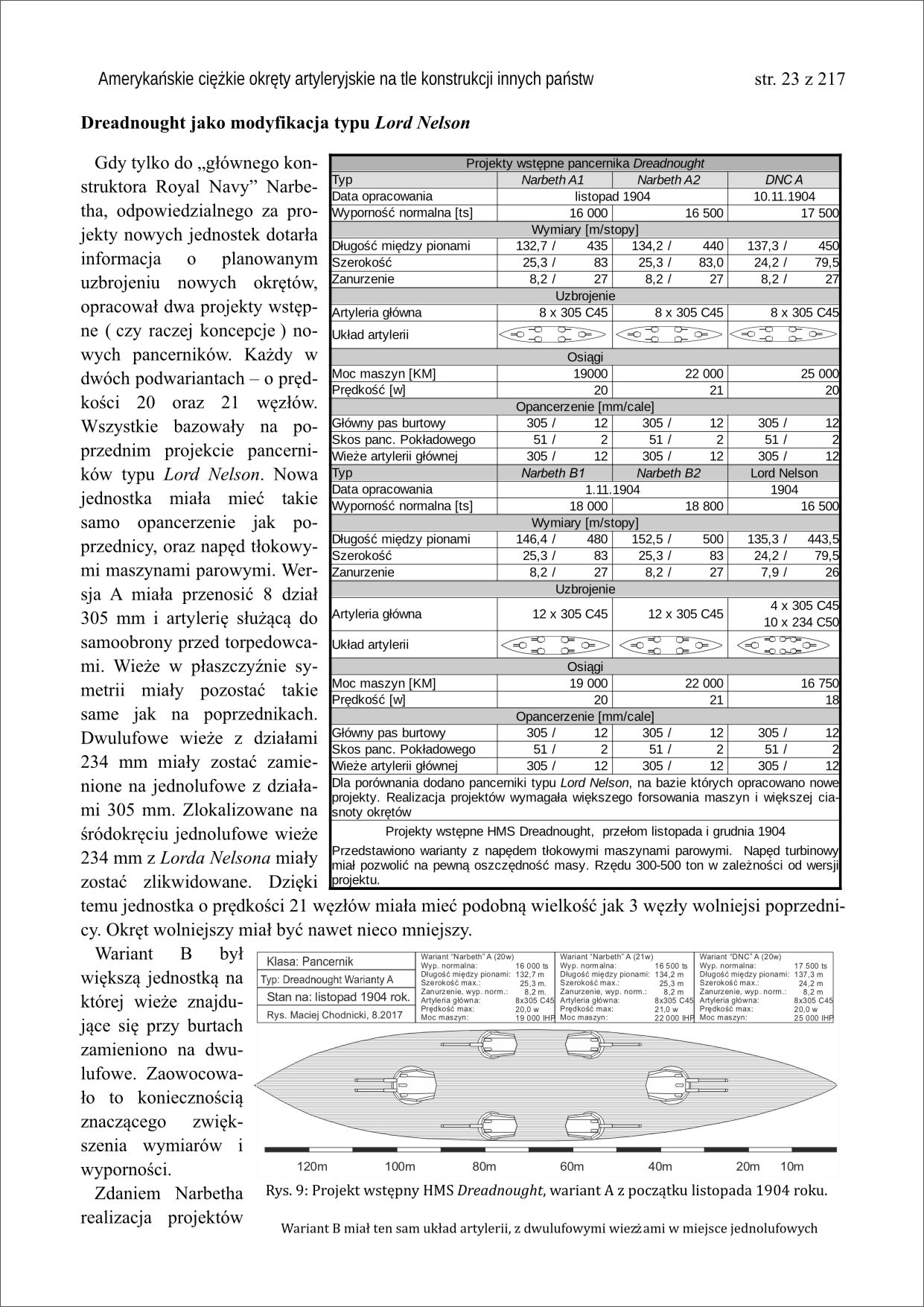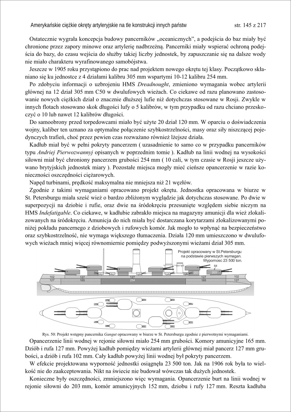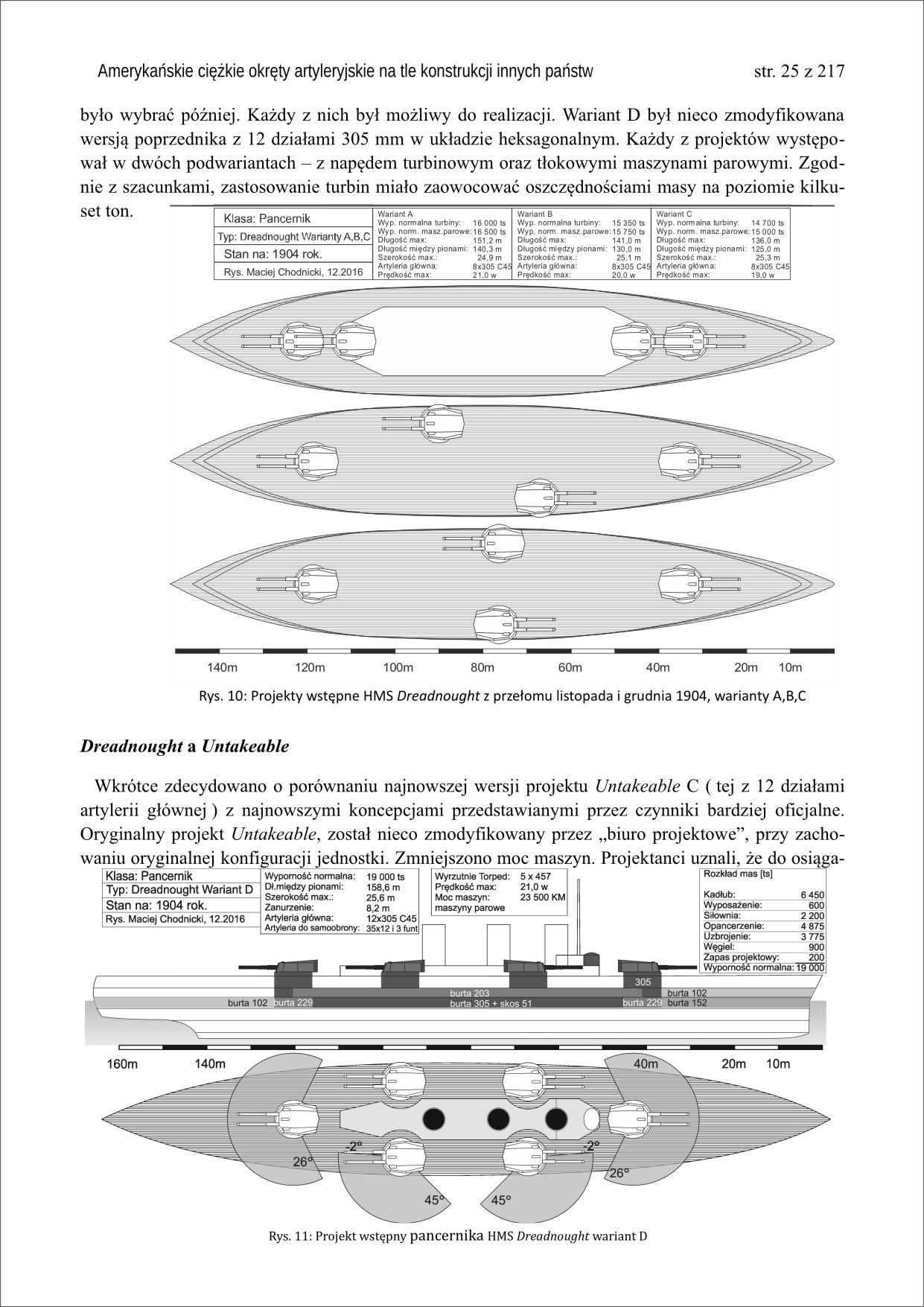 Jest to drugi tom, z planowanych sześciu (to nie pomyłka, ilość planowanych tomów zwiększyła się), dotyczący historii projektowania oraz konstrukcji amerykańskich ciężkich okrętów artyleryjskich. Omówione są wielkie krążowniki, oraz pancerniki budowane w USA. Każdy z typów został opisany wraz z projektowanymi w tym samym czasie konstrukcjami innych państw. Jako kryterium wyboru wybrano daty rozpoczęcia budowy okrętów. Występowały wówczas duże różnice w czasie budowy w poszczególnych krajach. Tom II obejmuje okres początków XX wieku. Opisano w nim pierwsze amerykańskie drednoty – od typu South Carolina do Florida włącznie. Wraz z nimi również wszystkie pancerniki i krążowniki liniowe, których budowę w tym czasie rozpoczynano na świecie. Dodatkowo zawarto opis genezy HMS Dreadnought oraz HMS Invincible, które wywarły ogromny wpływ na budownictwo okrętowe tego okresu. Opis zawiera założenia projektowe, oraz konstrukcję okrętów. Każdy opisany typ jest zilustrowany. Rysunki zawierają przekroje wzdłużne i poprzeczne, rozkład pomieszczeń, płyt pancernych, oraz rzut z góry. Na koniec opisu każdego typu amerykańskiego zamieszczony jest rysunek zbiorczy, na którym zamieszczono obok siebie rysunki wszystkich opisanych zagranicznych odpowiedników danego typu. Rysunki zostały wykonane w tej samej skali. Przekroje wzdłużne 1:1000, poprzeczne 1:500. Od tej zasady poczyniono nieliczne wyjątki, za każdym razem zaznaczone w tekście. Pozwala to na porównanie wielkości poszczególnych okrętów. Na końcu książki załączono dwie wkładki o rozmiarze A3, zawierające porównanie wielkości wszystkich opisanych w tym oraz poprzednim tomie ciężkich okrętów USA. Dodatkowo załączono dokładne opisy uzbrojenia. Działa zostały rozdzielone na artylerię ciężką, średnią i służącą do samoobrony przed torpedowcami. Posortowano je według kolejności pojawiania się w służbie, bez względu na kaliber czy narodowość. W przypadku uzbrojenia, które występowało na jednostkach opisywanych w tym i poprzednim tomie, opis powtórzono.